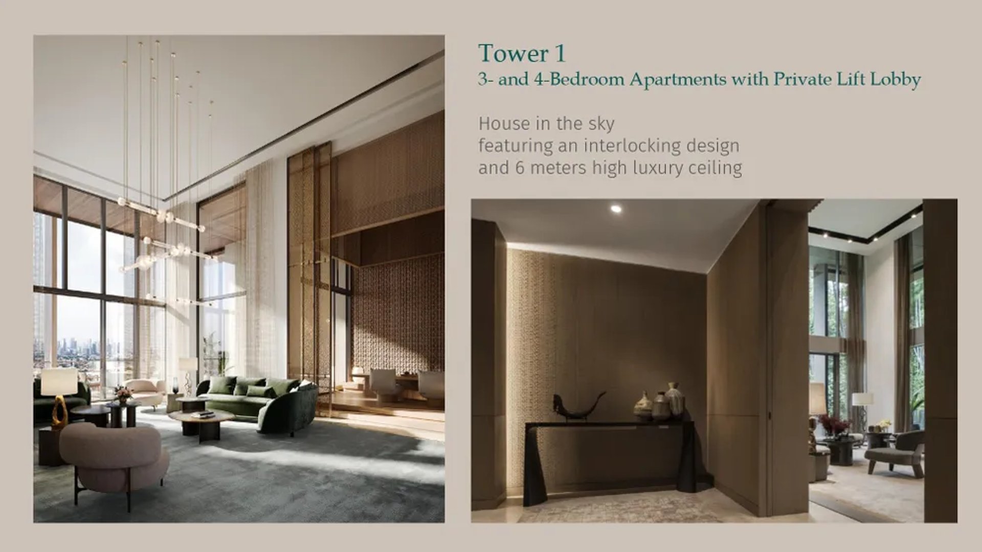 Tower 1 features interlocking system that provide spaces for double height volumes in the living dining area,