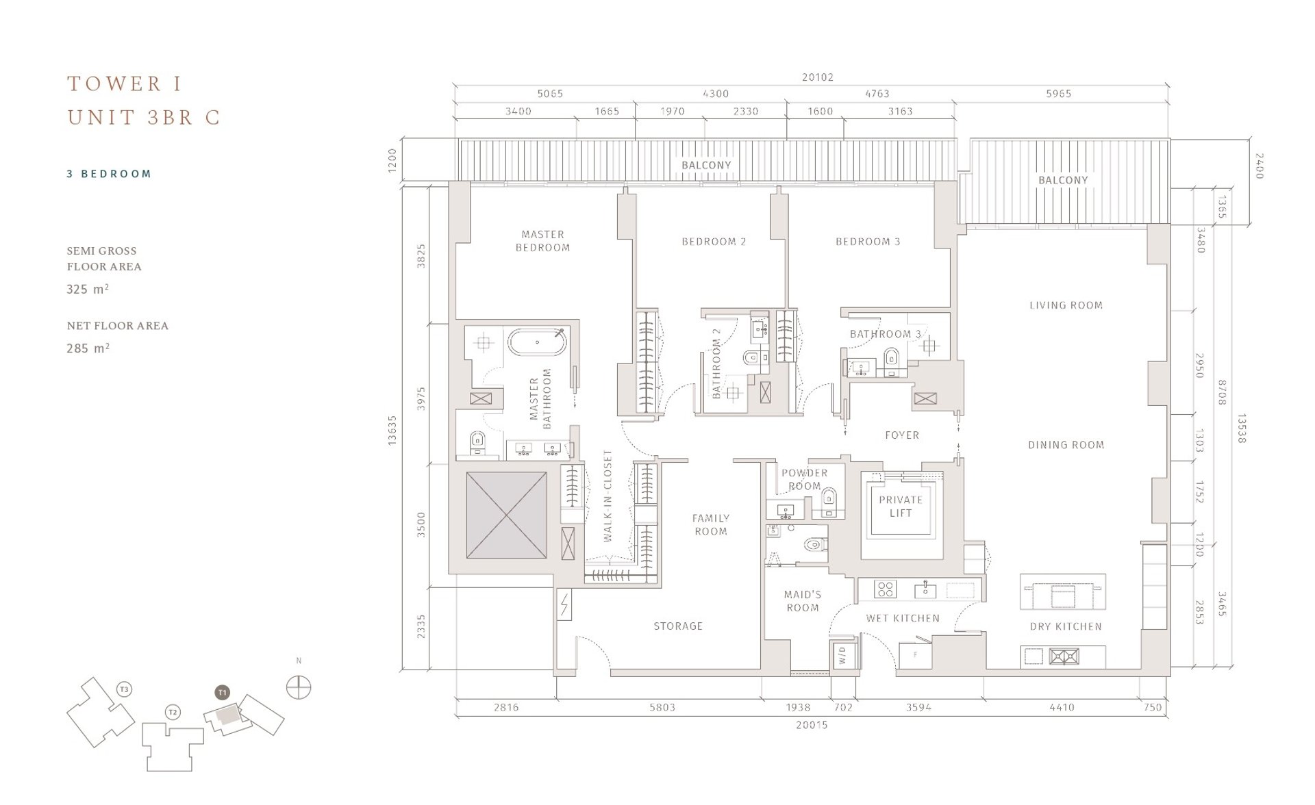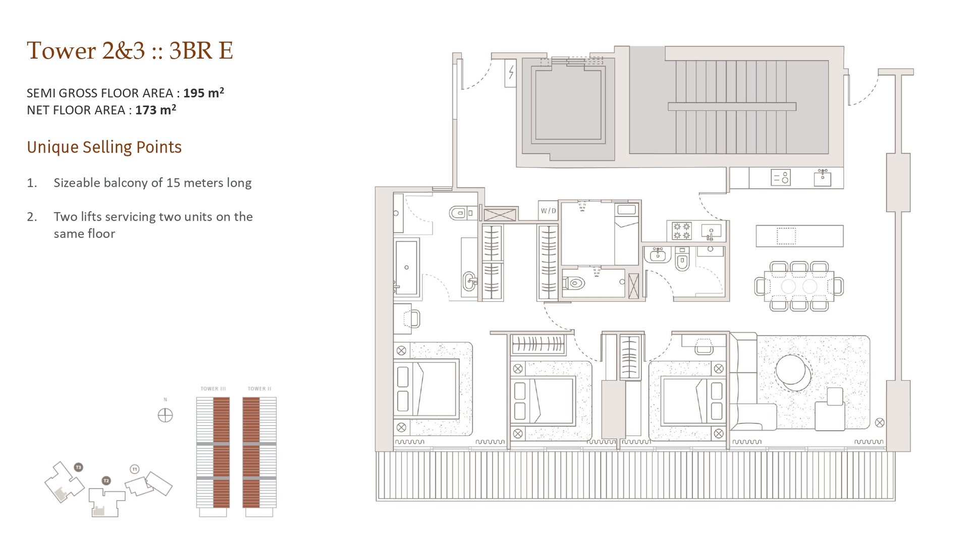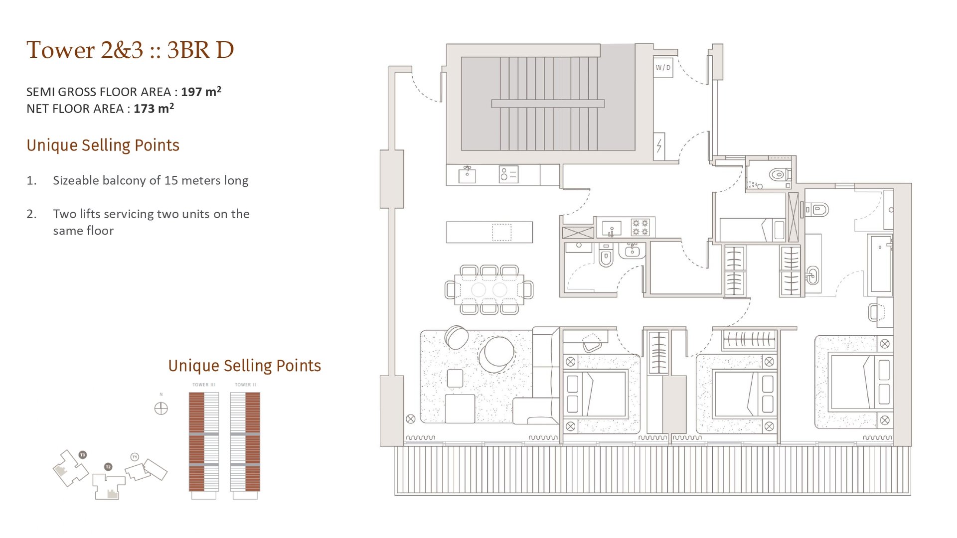 Kombinasi balkon panjang dengan interior unit 3 kamar menciptakan total living experience yang sangat premium.
