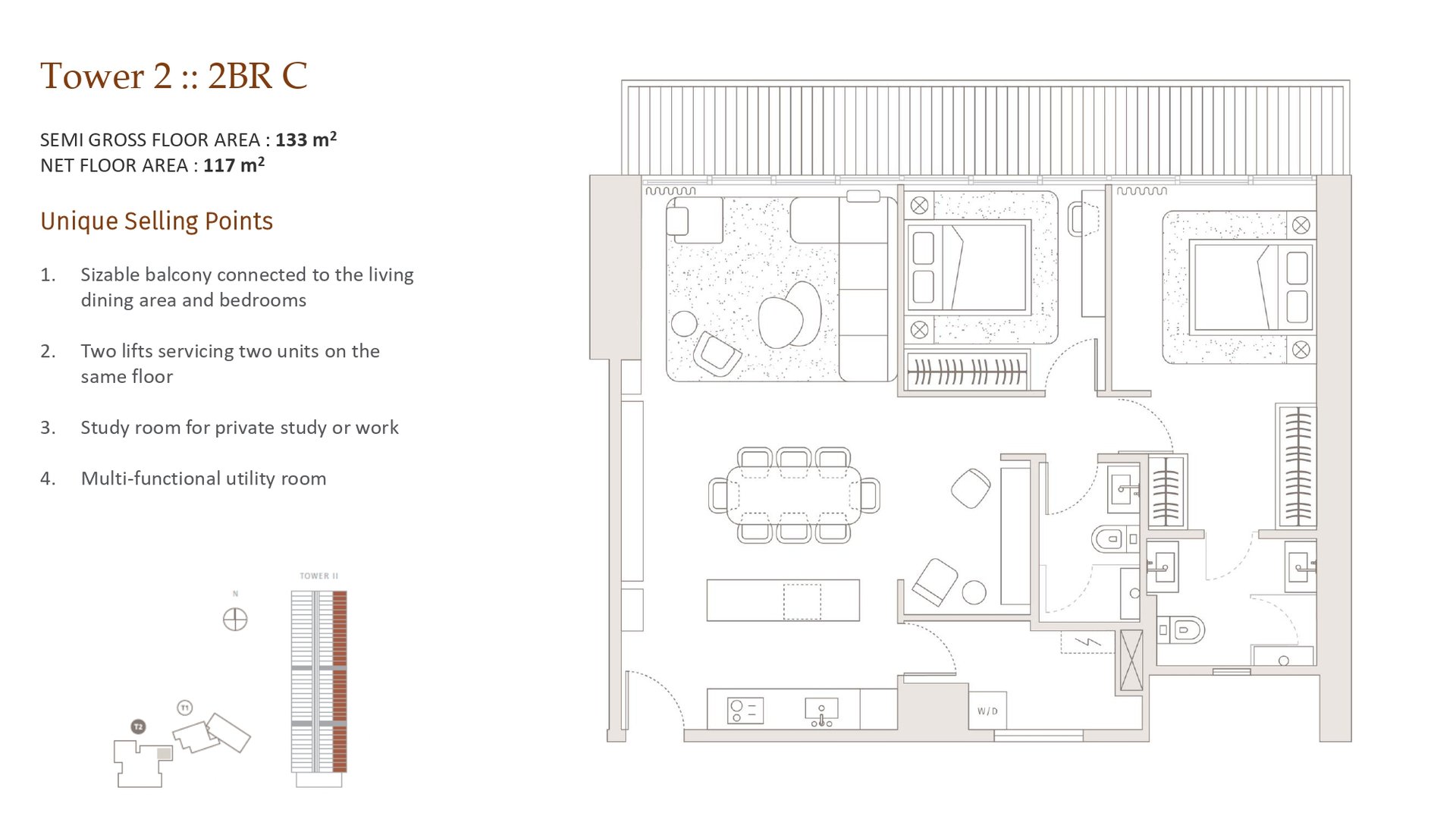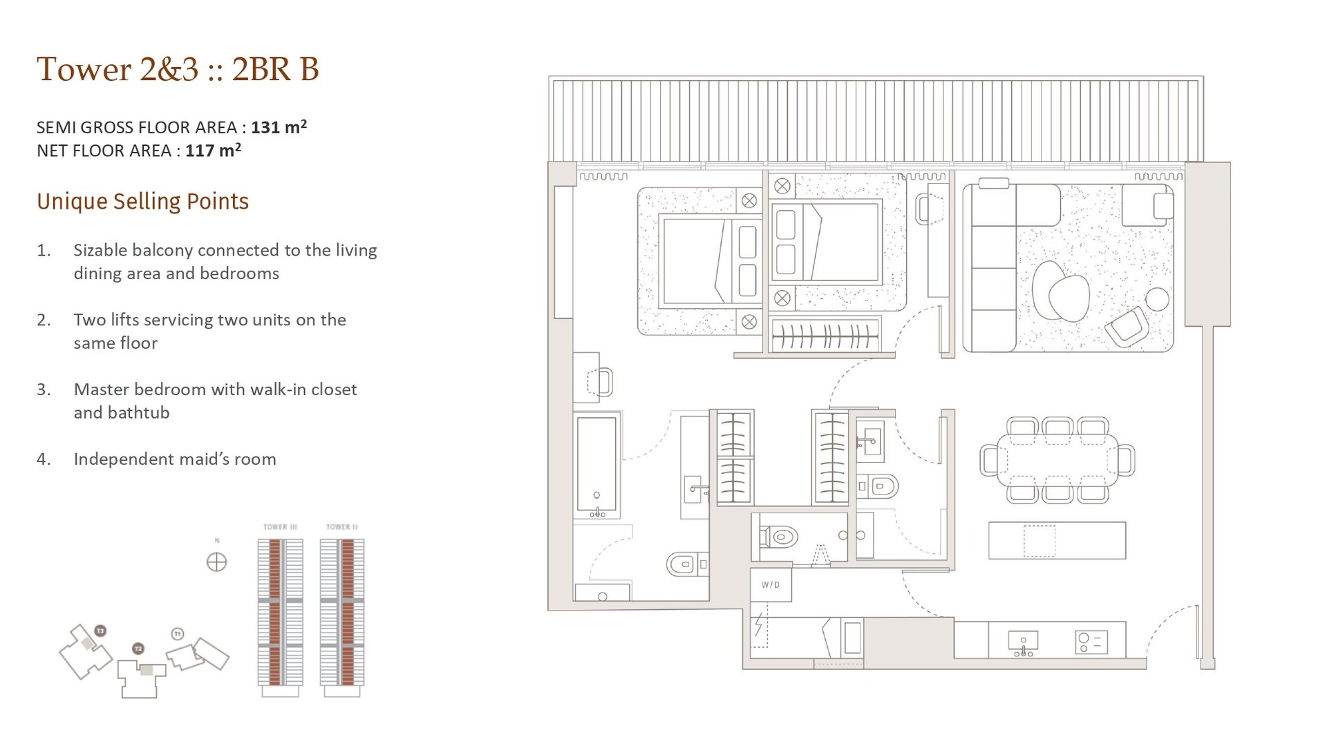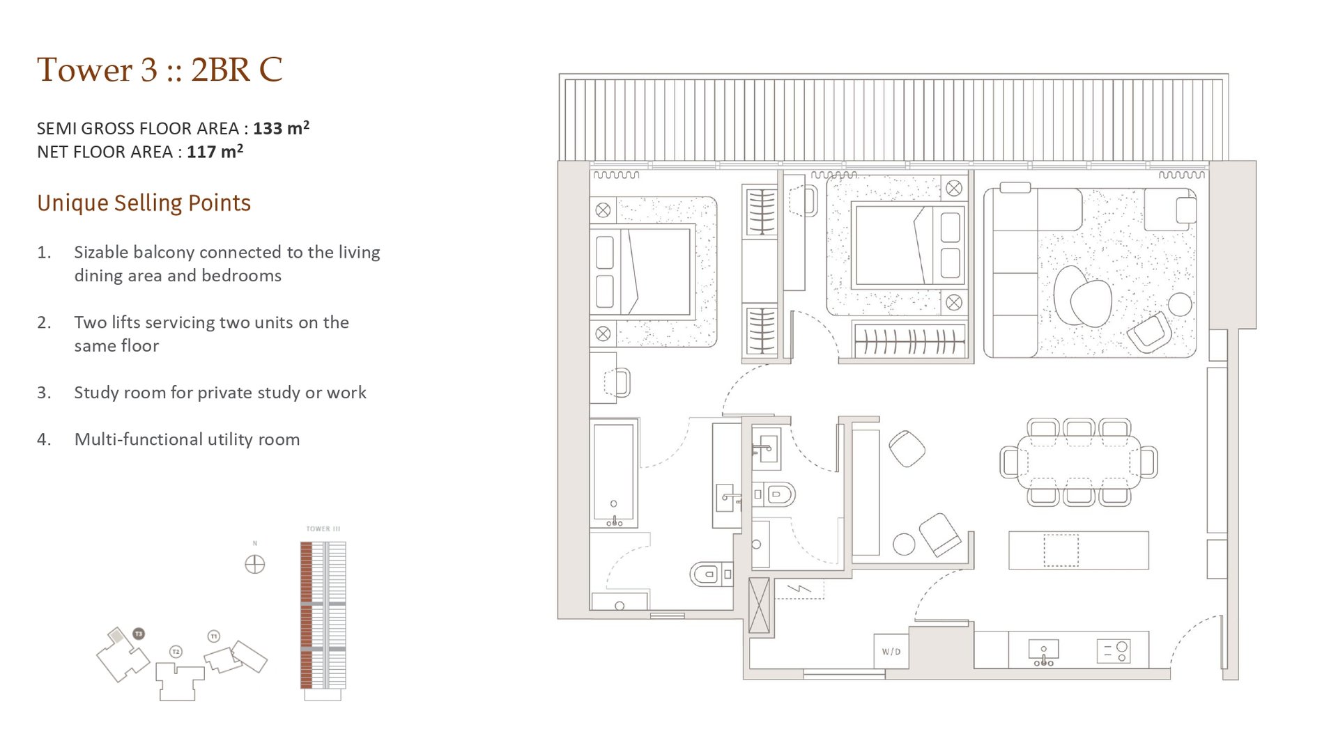 Kombinasi balkon panjang dengan interior unit 3 kamar menciptakan total living experience yang sangat premium.