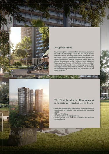 Dibangun di atas lahan luas dengan dominasi area hijau, Savyavasa menawarkan keseimbangan sempurna antara kemewahan arsitektur modern dan nuansa alam yang menenangkan, menjadikannya salah satu apartemen paling dicari oleh eksekutif, keluarga mapan, dan ekspatriat di Jakarta.