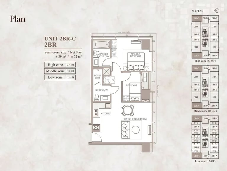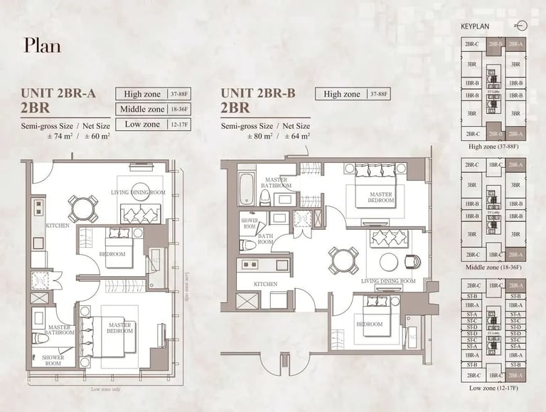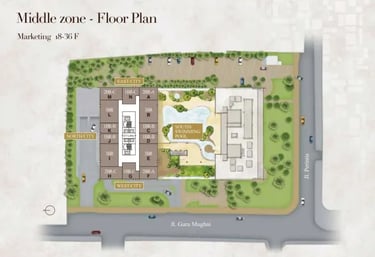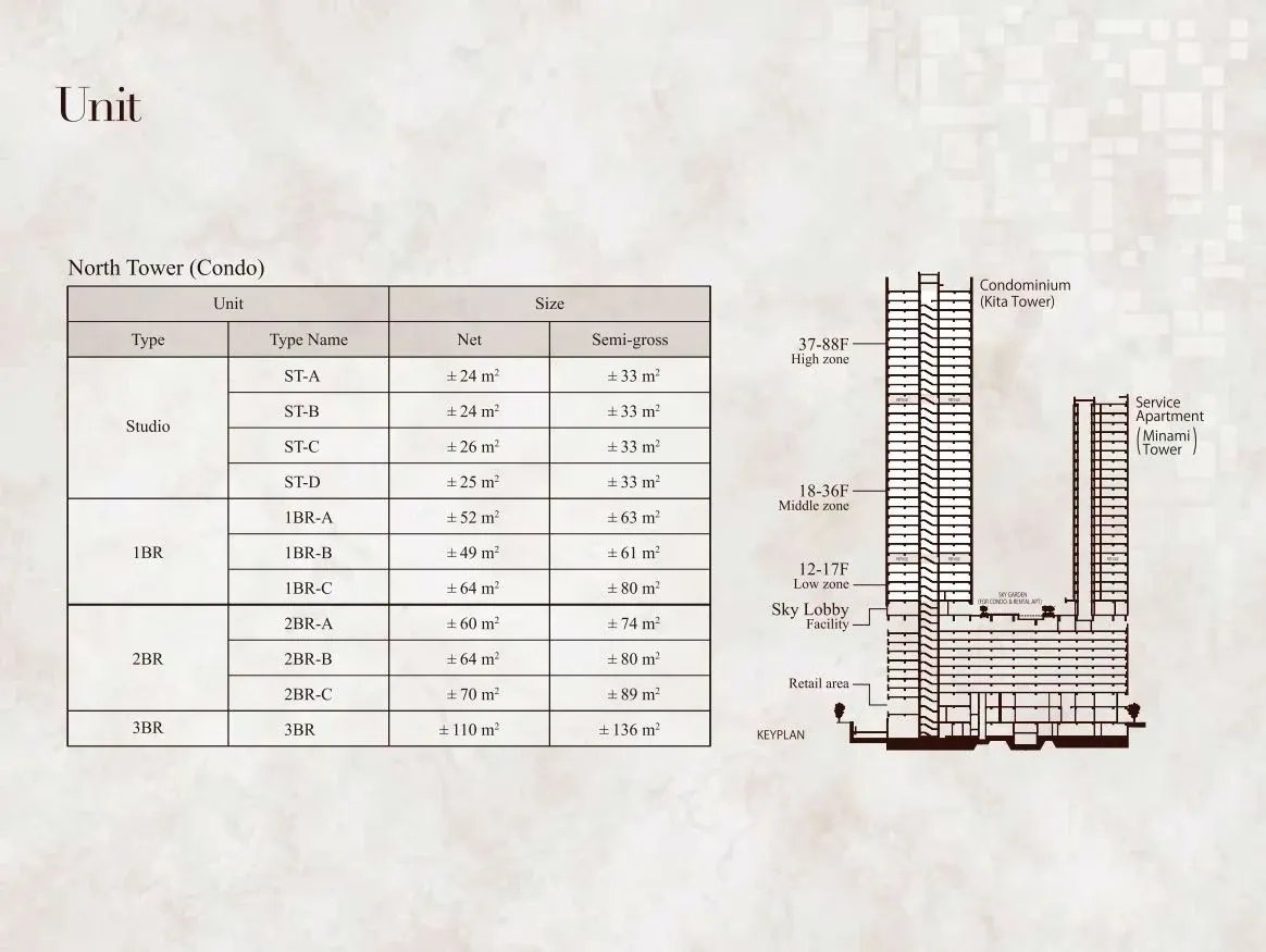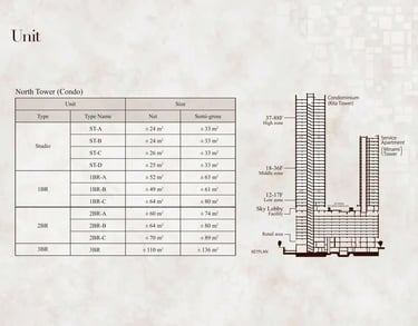 Luas Unit: bervariasi dari ± 74 m² hingga 89 m², tergantung konfigurasi dan lantai.