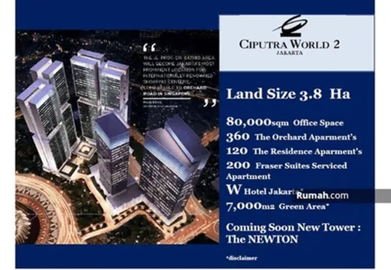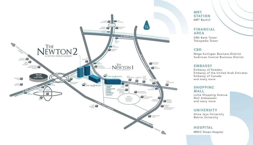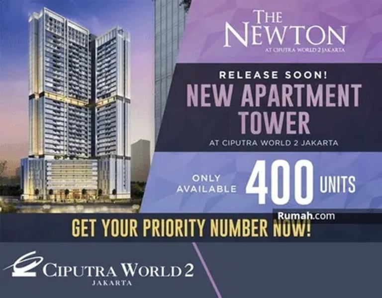The Newton Apartment is a vertical residential development located in Ciputra World Jakarta 2, an integrated mixed-use development in the heart of Jakarta CBD. The Newton Apartment consists of 2 apartment towers with total of more than 1,000 units offered. The units come in 3 different types to meet different needs of the customers, namely studio, 1-bedroom, and 2-bedroom. World-class amenities and facilities, such as swimming pool, jogging track, gym, podium parking, and green open space, are also available to pamper the residents amidst the hustle and bustle of modern lifestyle.